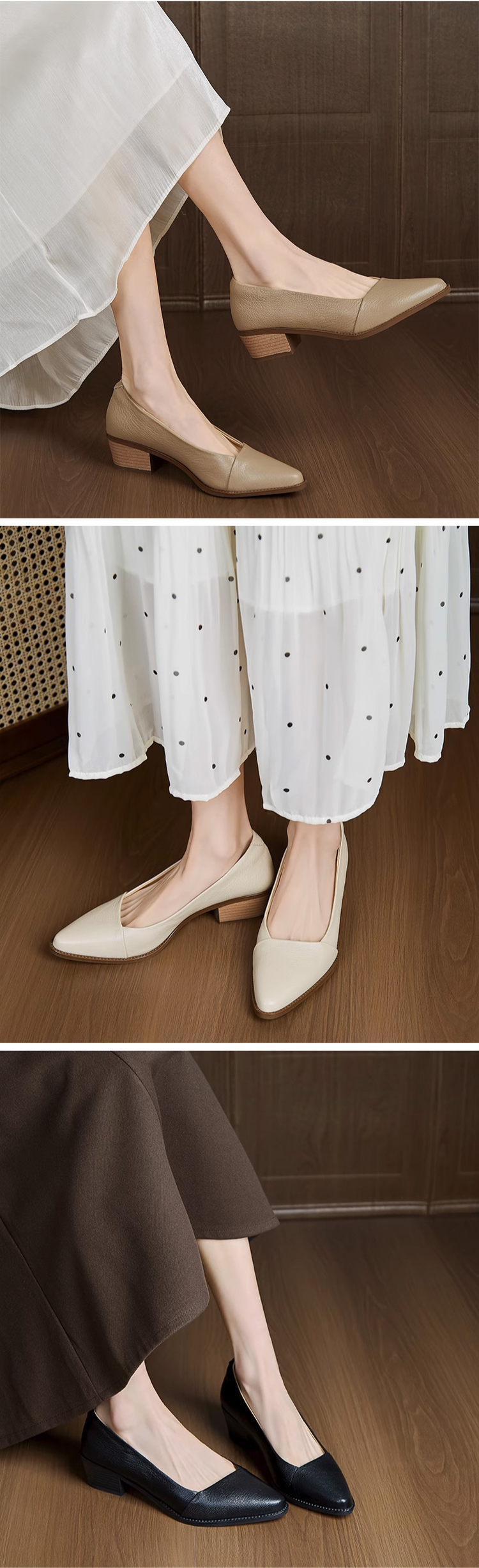 ● 세련된 스틸레토 디자인과 미들 굽, 통굽 조합으로 다리 라인을 예쁘게 살려주며 장시간 착용에도 발이 편안합니다.